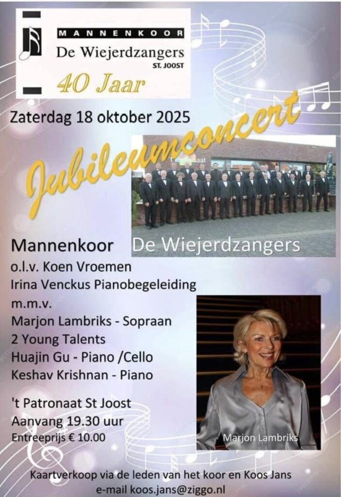 In 2025 heeft het mannenkoor “De Wiejerdzangers” hun 40-jarig jubileum gevierd met een schitterend concert m.m.v onder andere Marjon Lambriks en nog twee jonge talenten op de piano en cello. Het was weer een super jubileum.